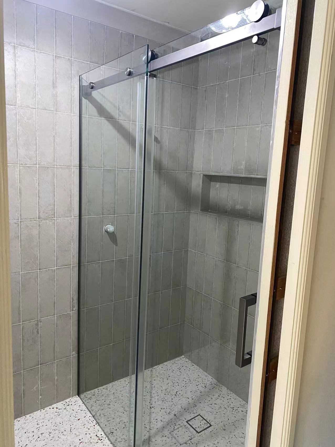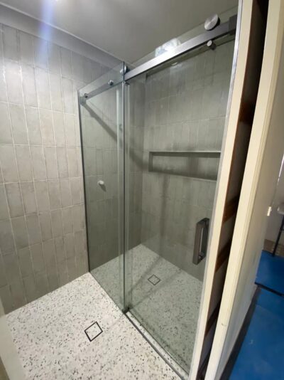 890-910 X 2000mm Wall to Wall Frameless Sliding Shower Screen Gunmetal Fittings